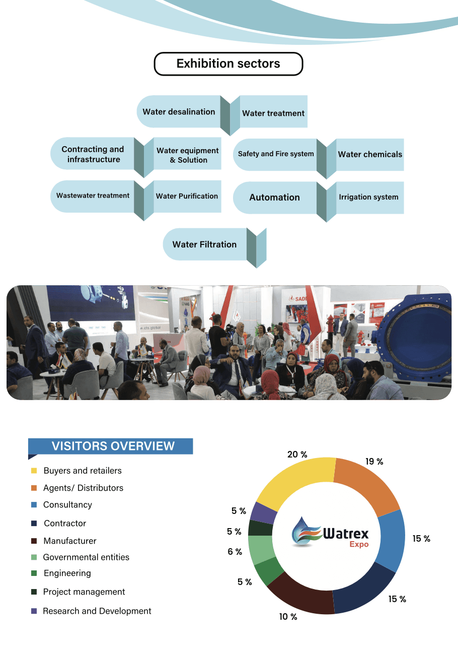 这种合作精神有望加速水废水和基础设施行业尖端技术、机械、产品和服务的本地化。 埃及开罗水处理展览会(Watrex Expo)是全球利益相关者深入了解埃及水务行业庞大且充满活力的生态系统、分享商机、建立联系和探索创新水务解决方案的完美门户。为国内外水行业参与者提供无与伦比的商机,让他们了解和探索埃及水市场的未来趋势。 埃及开罗水处理展览会(Watrex Expo)将成为欧洲、美国、中国、中东地区的制造公司进口国之间的连接点。让您可以同时看到和触摸来自数百家供应商的竞争产品,也是您与直接代表会面并获得同行即时反馈的唯一场所。