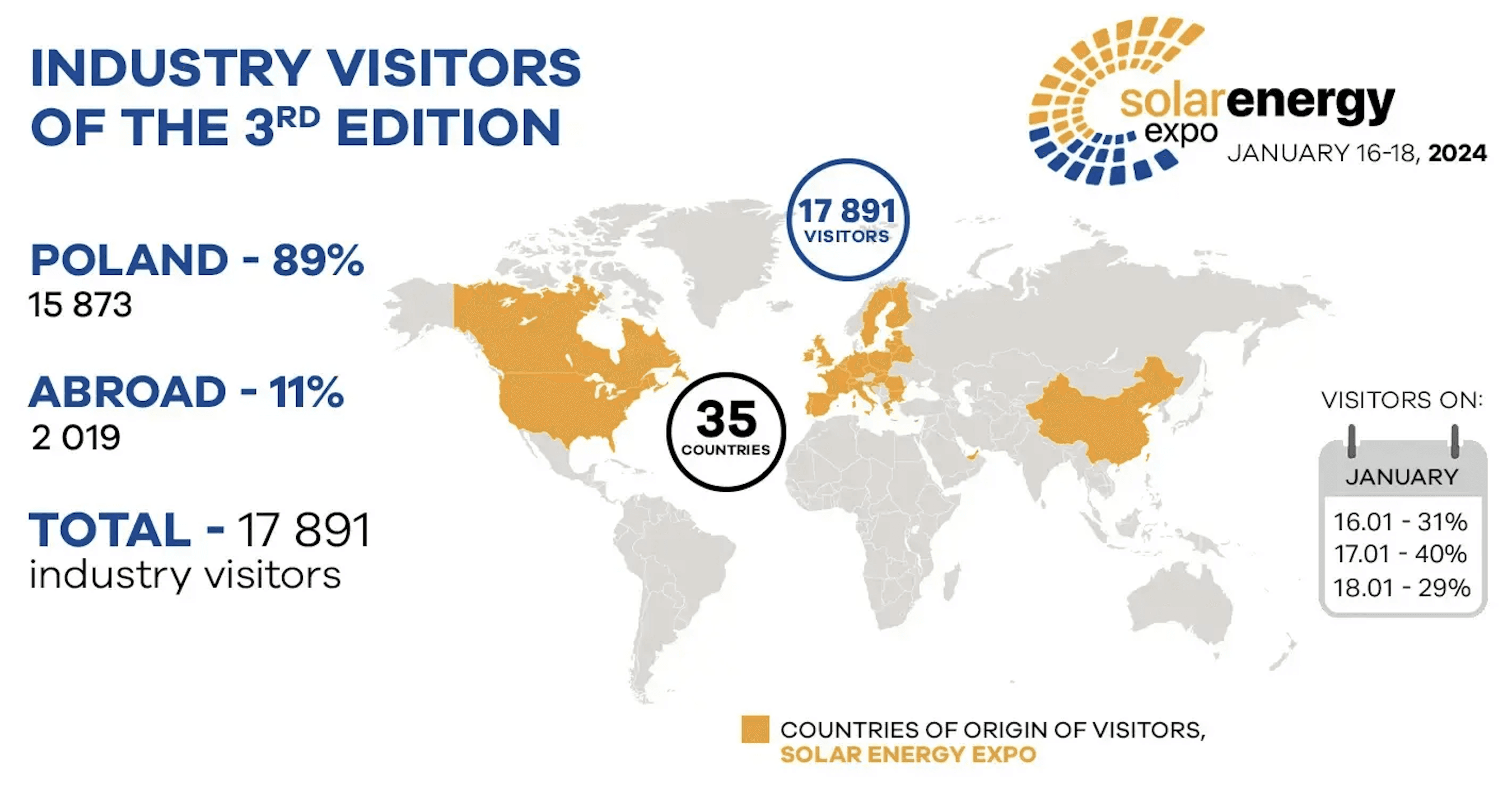 Solar Energy Expo 是波兰第一个全面致力于可再生能源行业发展和新趋势的行业交易会。2024 年第 3 届波兰太阳能展览会已经于 1 月 16-18 日在华沙成功举办,展会吸引了来自全球 30 多个国家的 400 多名展商共同参加,更有来自 50 多个国家的近 20000 名观众。